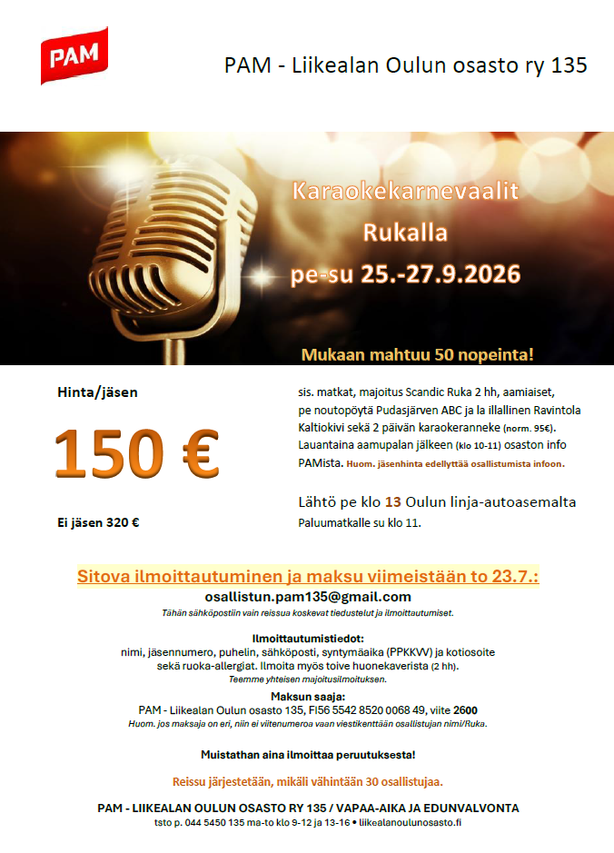 © 2026 PAM - Liikealan Oulun osasto ry 135 | Uusikatu 22, 4. krs, 90100 OULU